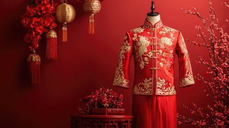 A striking red outfit displayed on a mannequin, surrounded by festive decorations, captures the essence of celebration and cultural richness in an Asian-inspired setting.