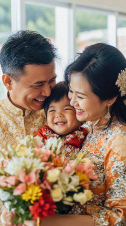 Smiling asian family wearing traditional clothing embraces affectionately while holding a colorful bouquet of flowers