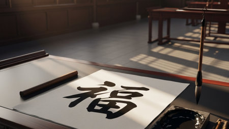 Traditional Chinese calligraphy tools laying on a wooden table with morning sunlight illuminating the scene