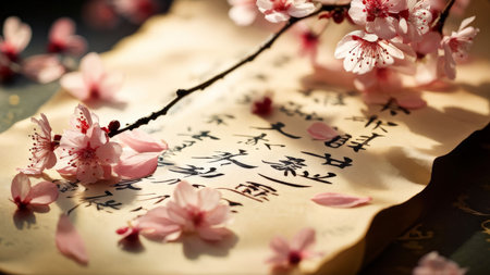 An elderly man is focused on calligraphy, using a brush and ink while sitting at a wooden table in a beautifully adorned studio. Cherry blossom decor enhances the peaceful atmosphere.