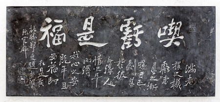 Chinese characters carved on a wall at the Temple of the Six Banyan Trees, Guangzhou, China.