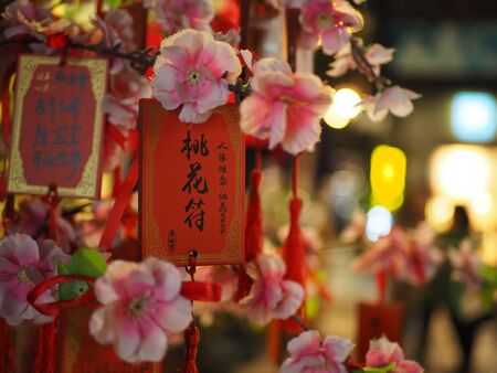 Shanghai, China; 10 18 2018: Red Chinese desire messaje with black letters, with flowers on a blurred lights background