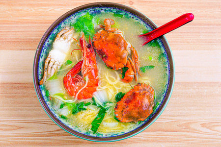 A bowl of fresh shrimp and seafood noodles