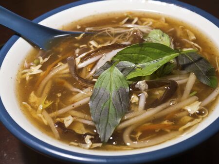 Hot and Sour Soup in bowl, top view, copy space