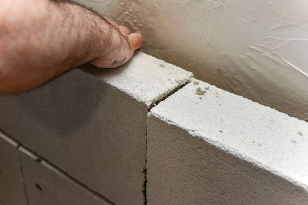 Worker lay foam block on mortar for building a wall in a house