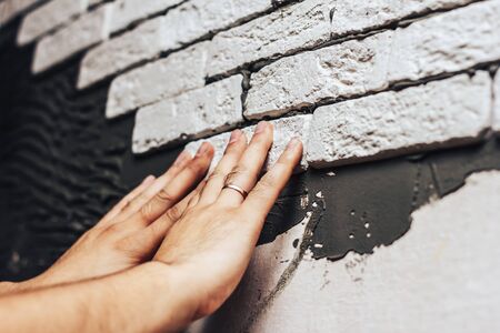 the plaster decorative brick is glued on a wall on cement glue on one brick