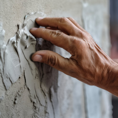 A detailed close-up shot shows hands carefully applying a ribbed adhesive substance to a wall, highlighting the texture and process.