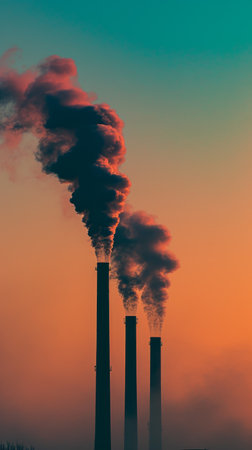 Thick black smoke bills from tall factory chimneys as the sky transitions to deep orange shades at dusk, highlighting industrial pollution.