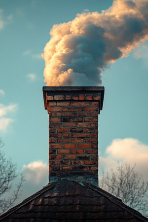 Smoke is coming out of a brick chimney against a blue sky with some clouds