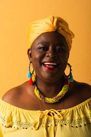 portrait of smiling middle aged african american woman in yellow turban and blouse with colorful accessories on yellow