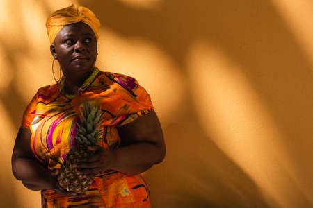 middle aged african american woman in yellow turban and colorful dress holding pineapple on orange