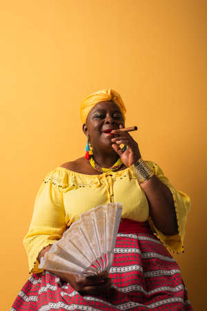 middle aged african american woman in bright clothes sitting with fan and smoking cigar on yellow