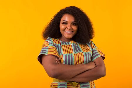 Young african-american woman isolated on yellow studio background, facial expression. Beautiful female half-length portrait. Concept of human emotions, facial expression. Standing crossing hands.