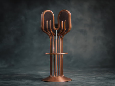 An artistic bronze sculpture stands prominently against a dark textured backdrop. The design features interconnected lines and curved forms, creating a visually striking composition. The lighting highlights the metallic texture and form, providing depth. This image could be suitable for various editorial and commercial applications.