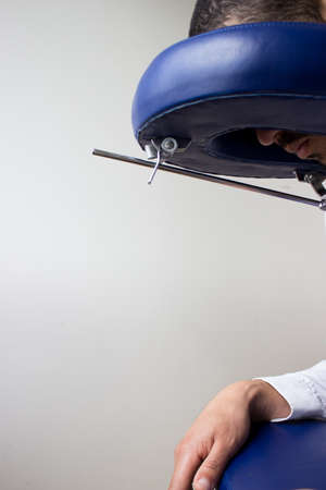 Adjustable cushioned headrest on a padded medical or therapy table.
