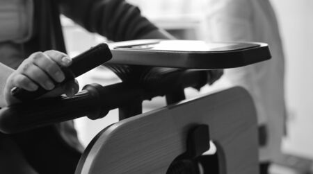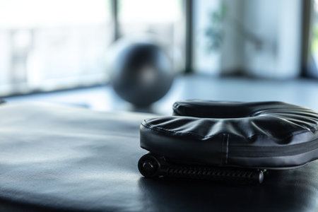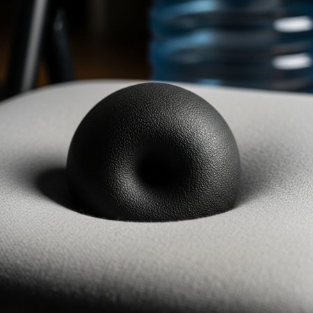 A square composition focusing intimately on the indentation created by a heavy, matte black therapeu