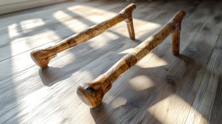 A pair of wooden fitness tools resting on a sunlit floor, showcasing natural materials and simple design, perfect for health and wellness activities.
