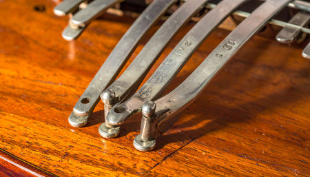 The polished metal tines of a traditional kalimba rest on a warm wooden base, waiting to be played.