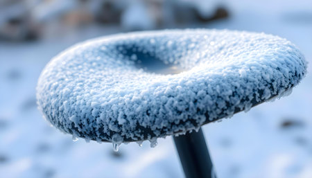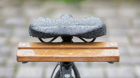 A close-up view of a wet bicycle seat with droplets of water on it, resting on a wooden rack. Captured on a rainy day, this image showcases urban life and outdoor activities.