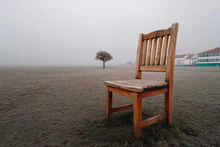 A solitary wooden chair is positioned in a misty field, with a tree visible in the distance.