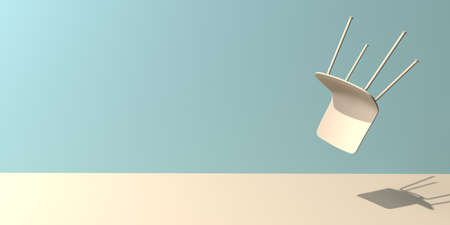 Man picking up blue chairs one on top of another with an orange background. Adaptation of school and academy chairs to the new normal.