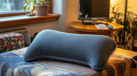 This image features a comfortable lumbar support pillow resting on a colorful blanket in a cozy living room, perfect for enhancing relaxation and style.