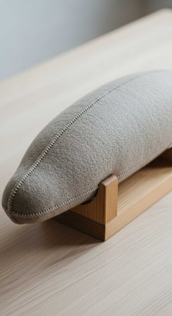 A gray fabric cushion with stitching rests on a light wooden stand.