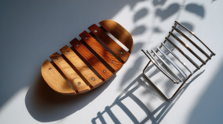 This image showcases a wooden tray paired with a sleek metal chair, beautifully highlighting minimalist design elements and playful shadows on a bright surface.