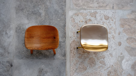 This image features an artistic arrangement of a wooden chair and a metallic chair on a textured stone background, showcasing modern design elements.