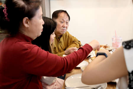Chinese family traditional wearing clothes performing a tea ceremony in a decorated tea room
