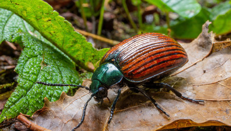 Black beetle perched on vibrant leaves, showcasing intricate details and textures. Nature and entomology concept with green background.