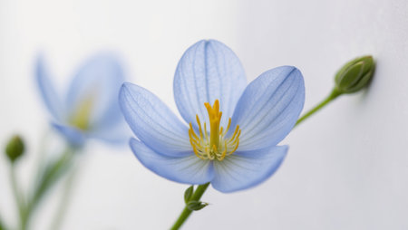 AI Generated. A tight shot of a blue blossom featuring a yellow stamen at its core