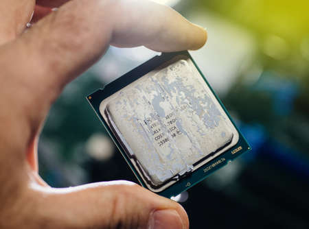 Paris, France - May 31, 2019: Side view of engineer male hand holding new professional Intel Xeon E5-2687w v4 CPU processor with Dell Precision Workstation in the background