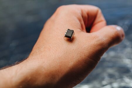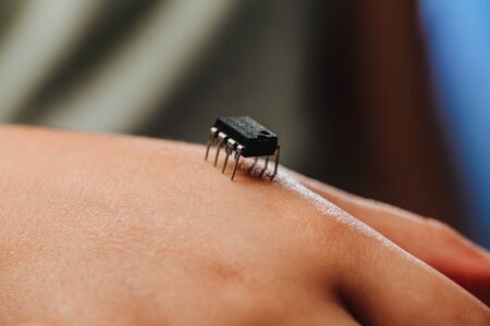 Implantation of a small black chip in hand. Chipization of people after an epidemic coronavirus.