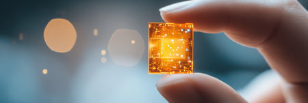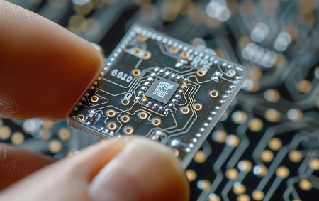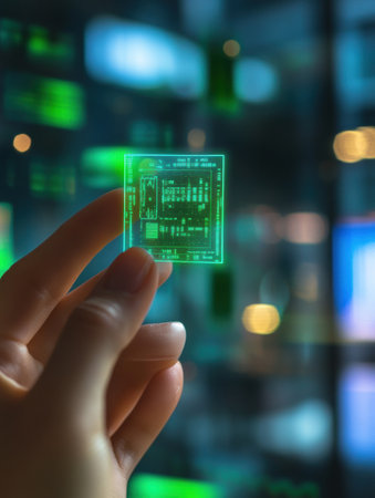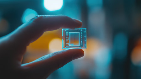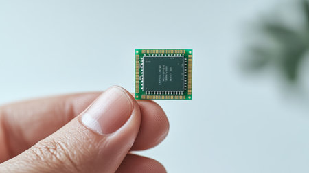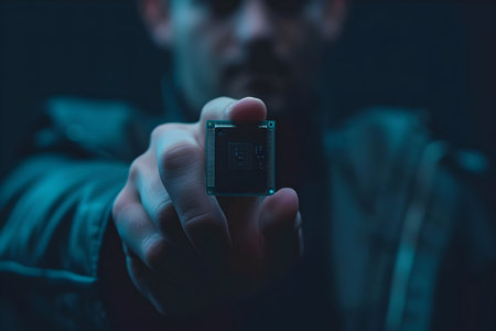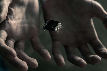 A man holding a microchip showcasing innovation in digital technology and electronics. Concept Digital Technology, Innovation, Electronics, Microchip, Man