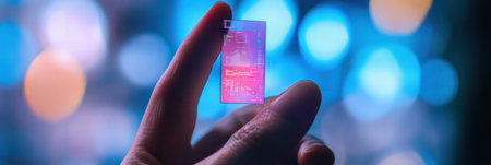 The hand grips a micro biochip featuring a vibrant holographic display that illustrates various health metrics in low light.