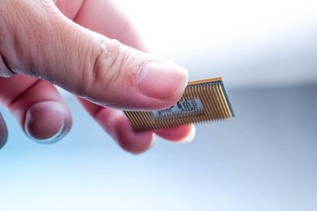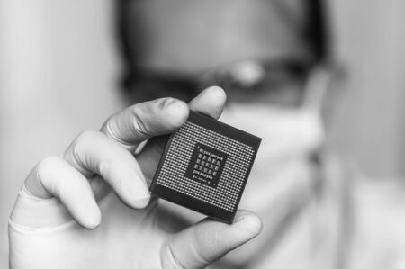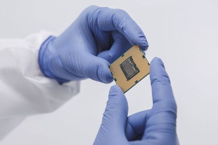 The engineer's gloved hand is holding the CPU chip against the background of the motherboard. Concept of high-tech hardware microelectronics