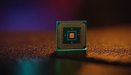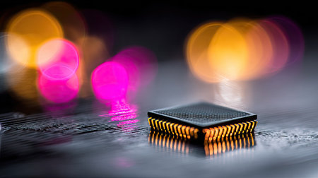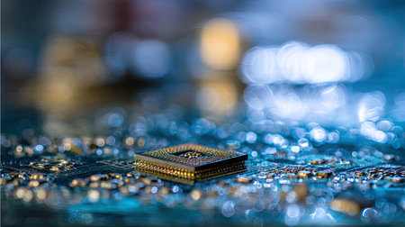 This image showcases a close-up of a central processing unit. The composition highlights intricate details with a dark backdrop and out-of-focus highlights. The lighting creates a sense of depth, with the chip reflecting light. The image may be suitable for illustrating technological advancements or concepts within the digital sector.