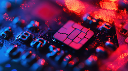 Detailed view of a microchip integrated onto a red illuminated circuit board.