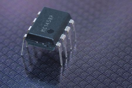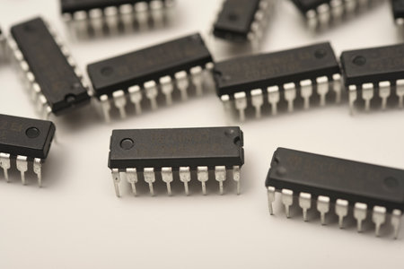 Microchips in a DIP case on a white background. A microelectronic element. Black microchips.