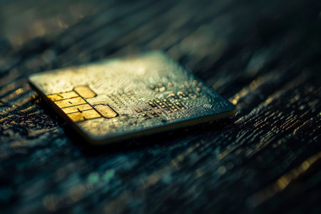 Low key macro shot with old credit card. Close up of chip for secure payment.
