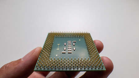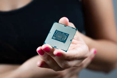 technology cyber electronic concept. cpu microprocessor chip in hand