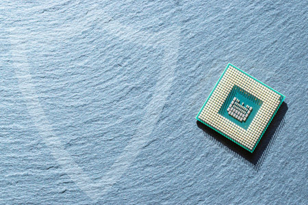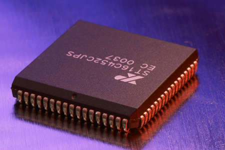 Processor to the computer. Concept for technology and computing. Detail of connectors. CPU Chip Processor for tech science background.