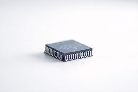 This close-up image showcases an electronic circuit board component featuring various chips and pins, illuminated by soft light. Perfect for technology themes.