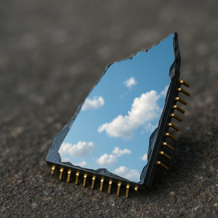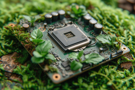 This close-up image showcases a central processing unit mounted on a circuit board, featuring a gold heat sink and various electronic components. It highlights intricate details and technological precision.