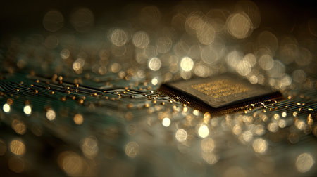 A golden computer chip is featured on a circuit board with glowing bokeh lights.