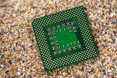 Timisoara, Romania - October 17, 2020: Close-up of an Intel Celeron FV80524RX366128 processor, 366 Mhz, socket 370 with sand in the background.