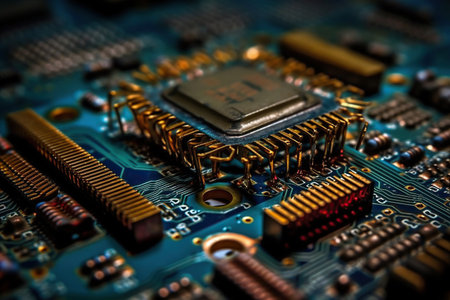 Close up of an electrical circuit board with a CPU, a microchip, and other electronic components in the background. Generative AI