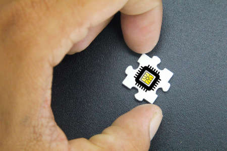 Fingers holding cpu microchip on black background. Micro photography, top view.