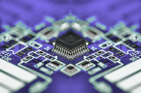 Electronic components, chips and capacitors on the blue pcb, close up view. Technology concept